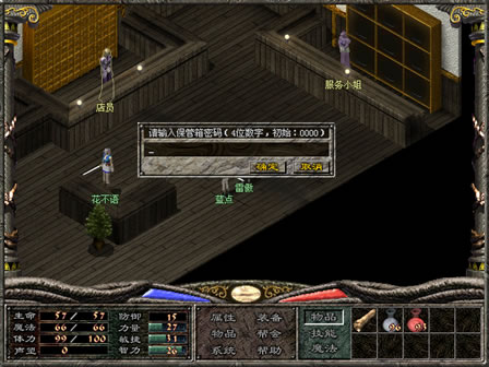 | 第一次进入银行时需要密码,密码的最初值为0000,如果按保管窗口锁状图标时此密码也可以更改.自己的银行密码可千万不要忘记哟! |